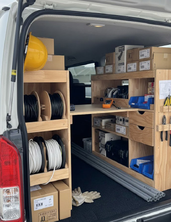 電気工事特化の機能美。電線ドラムと棚で現場効率を劇的に変える。