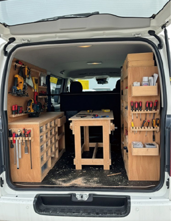 大工さんの知恵が詰まった移動作業場。収納棚と作業台で現場を効率化。