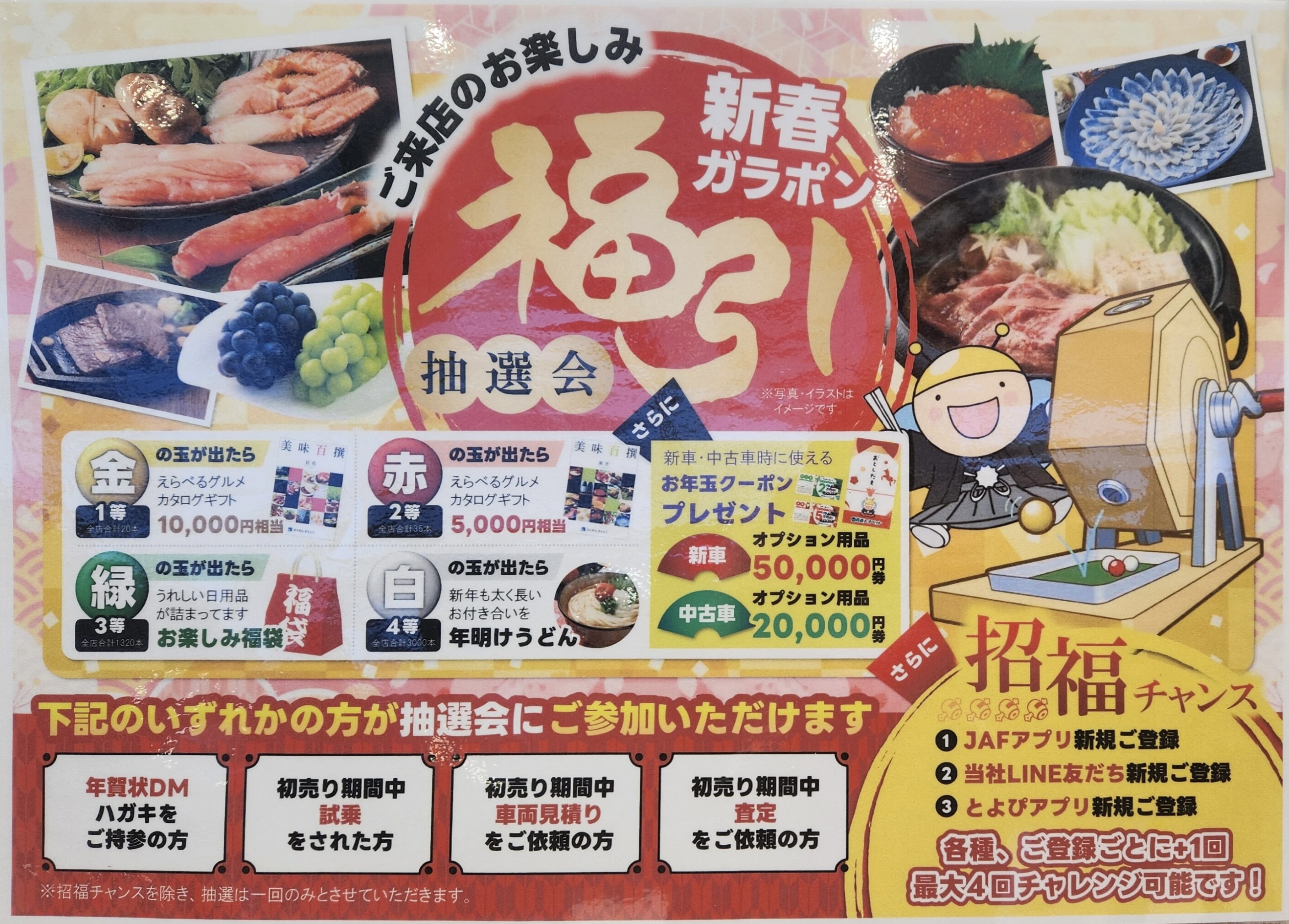 カタログギフトや、お車ご購入時に使える オプションのお年玉クーポン など、うれしい景品が当たるチャンスです!