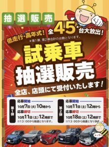 特に目玉の低走行、高年式の、試乗車抽選販売もやっています!!
