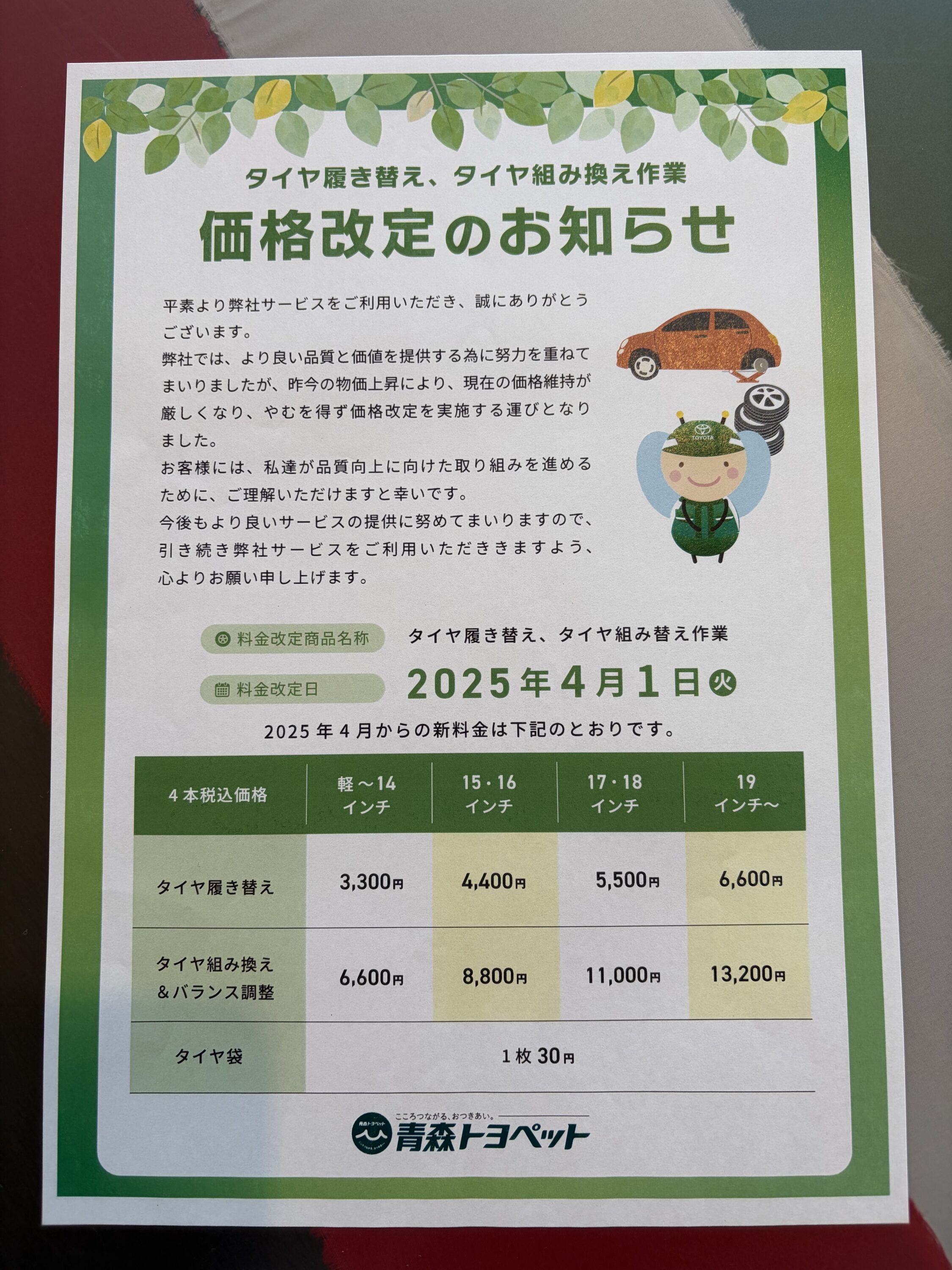 今年の4月からタイヤ交換の値段が
