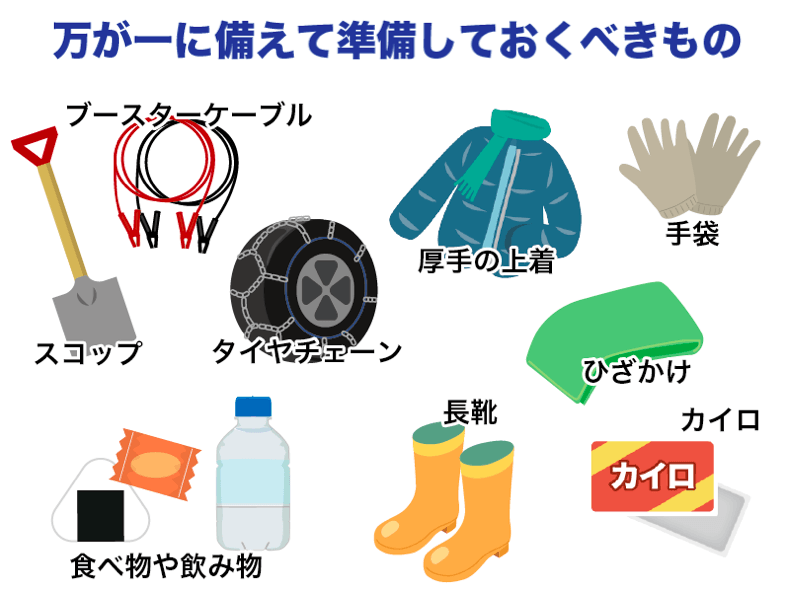 スノーブラシやスコップはもちろんのこと、万が一立ち往生した時のために毛布や防寒着、非常食もあれば安心ですね!
