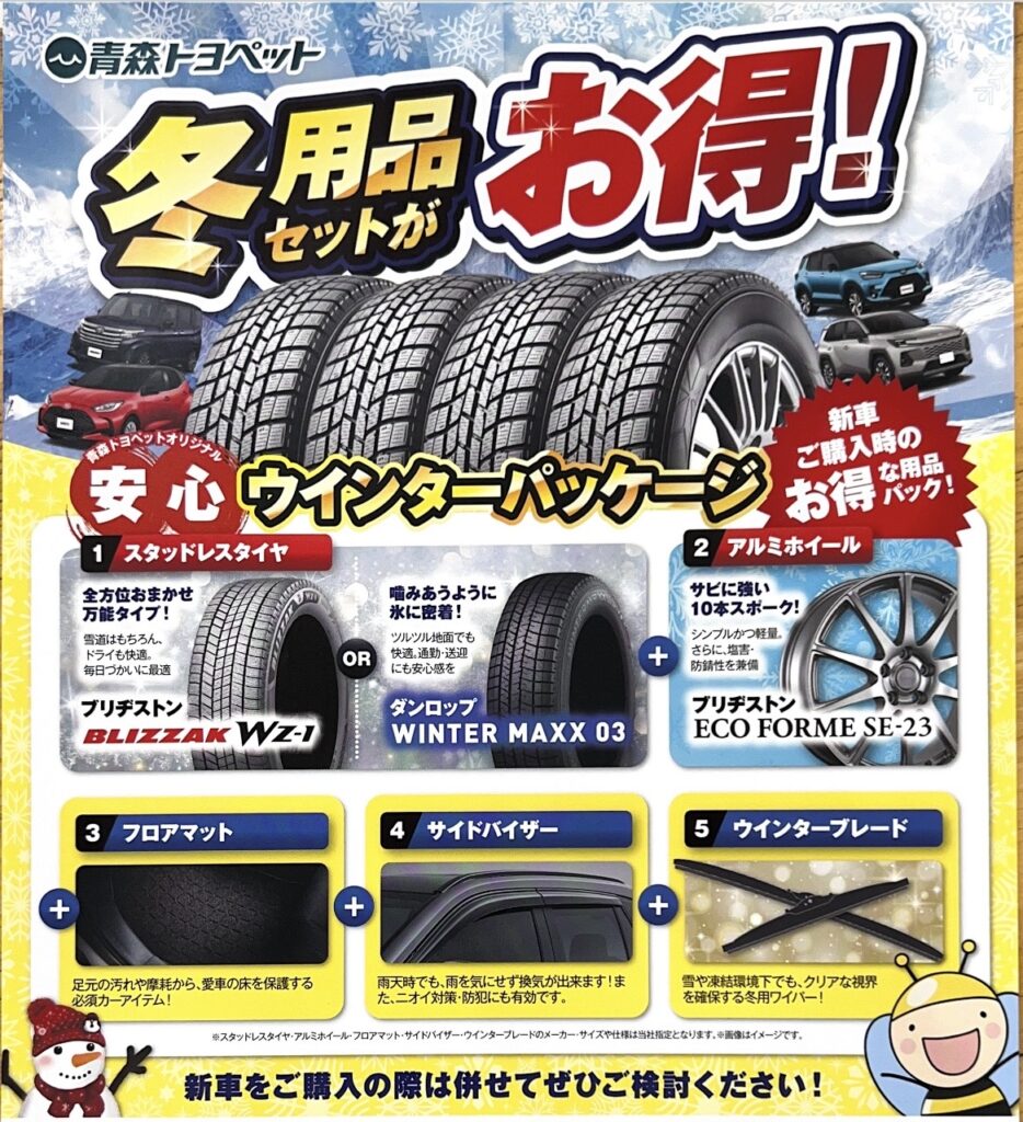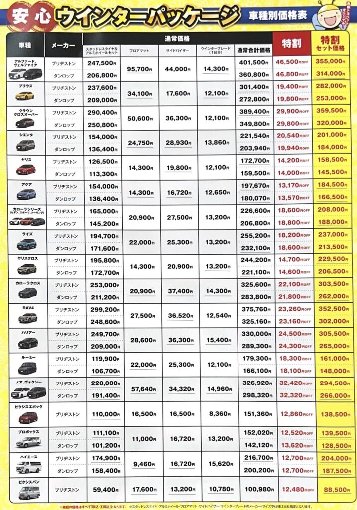 2026年02月24日 お得な冬用品セットのご案内 こんにちは、青森西店工藤です! 冬用品はセットがお得になっております✨ 車種別価格表も掲載しておりますのでご覧ください。 例えば、どの世代にも人気なライズでは通常合計価格255,200円が237,000円に‼️😳 詳しくはどうぞ店頭までお問い合わせくださいませ♡^^ 🚗トヨタの車なら🚗 🐝とよぴのお店🐝 🍎青森トヨペット🍎