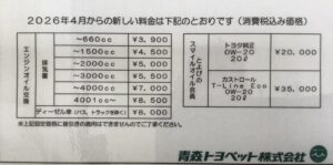 2026年03月15日 エンジンオイル交換料金値上げのご案内 平素より当店をご利用いただき、誠にありがとうございます。 このたび、原油価格高騰や仕入れ価格の上昇しております。 これまで価格維持に努めてまいりましたが、現行価格でのご提供が難しい 状況となりました。 急ではございますが、2026年4月1日よりオイル交換料金を改定させていただくこととなりました。 今後もより良いサービスの提供に努めてまいりますので、 何卒ご理解の程よろしくお願いします。 今後とも当店をよろしくお願いします。