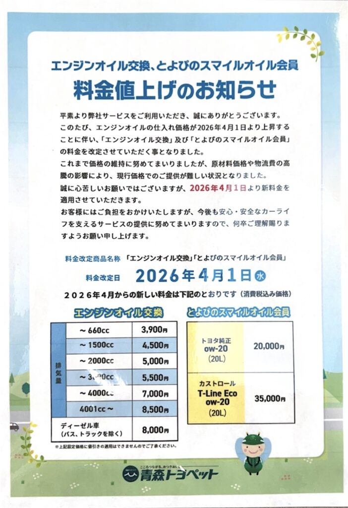 この度は原材料費・物流費高騰のため、2026年4月1日よりエンジンオイル関連料金を改定いたします。