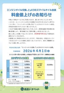2026年03月27日 料金改定のお知らせ 皆さん、こんにちは! 4月1日より、オイル交換の料金が 値上げとなります。 お客様にはご負担をおかけいたしますが 何卒ご理解賜りますようお願いいたします。 トヨタのクルマなら とよぴのお店 🚗青森トヨペット🚗